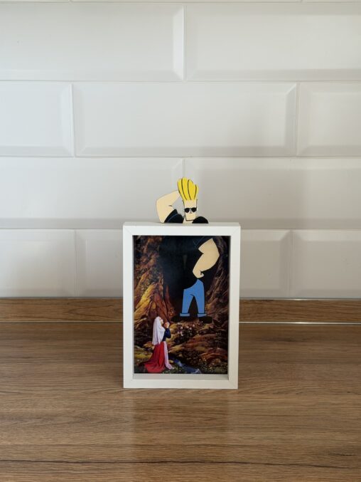 A playful blend of pop culture and devotion, Krusifiks reinterprets a traditional religious image through a contemporary and ironic lens. Combining sacred imagery with everyday symbols and comic-like…