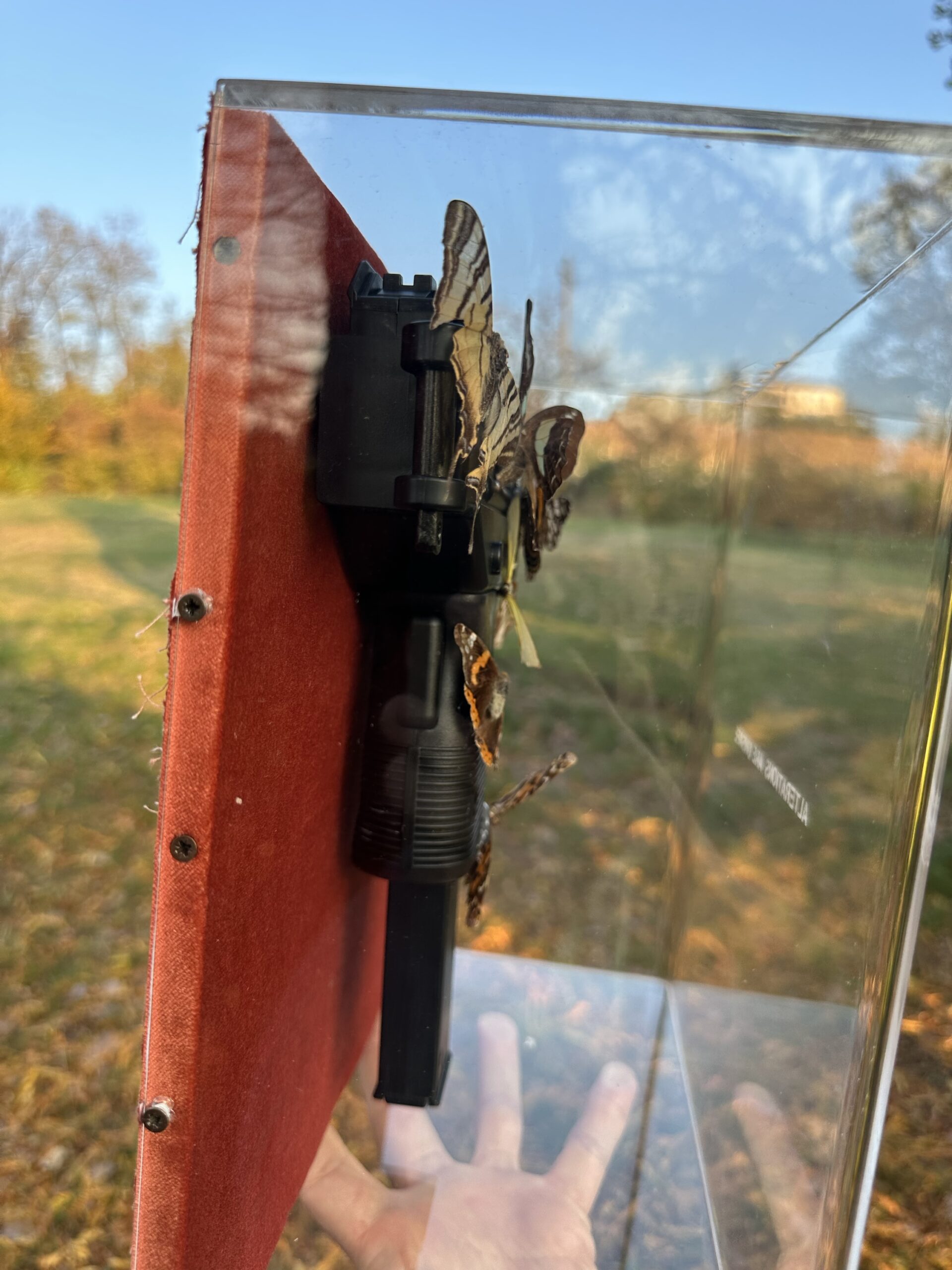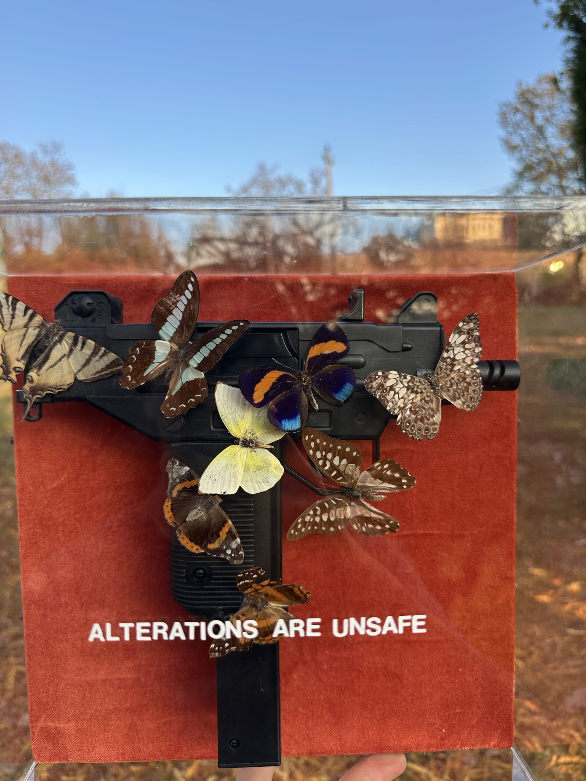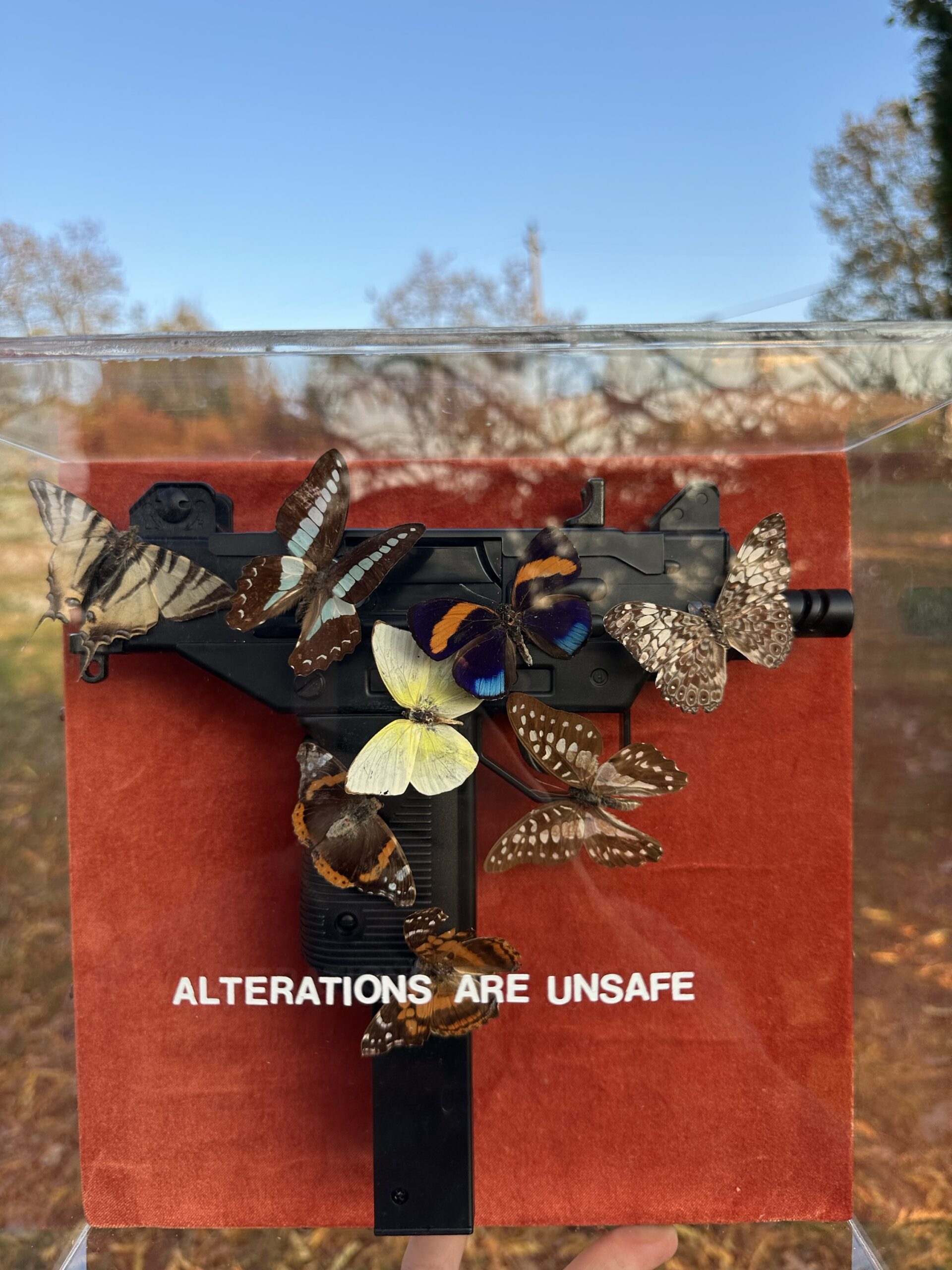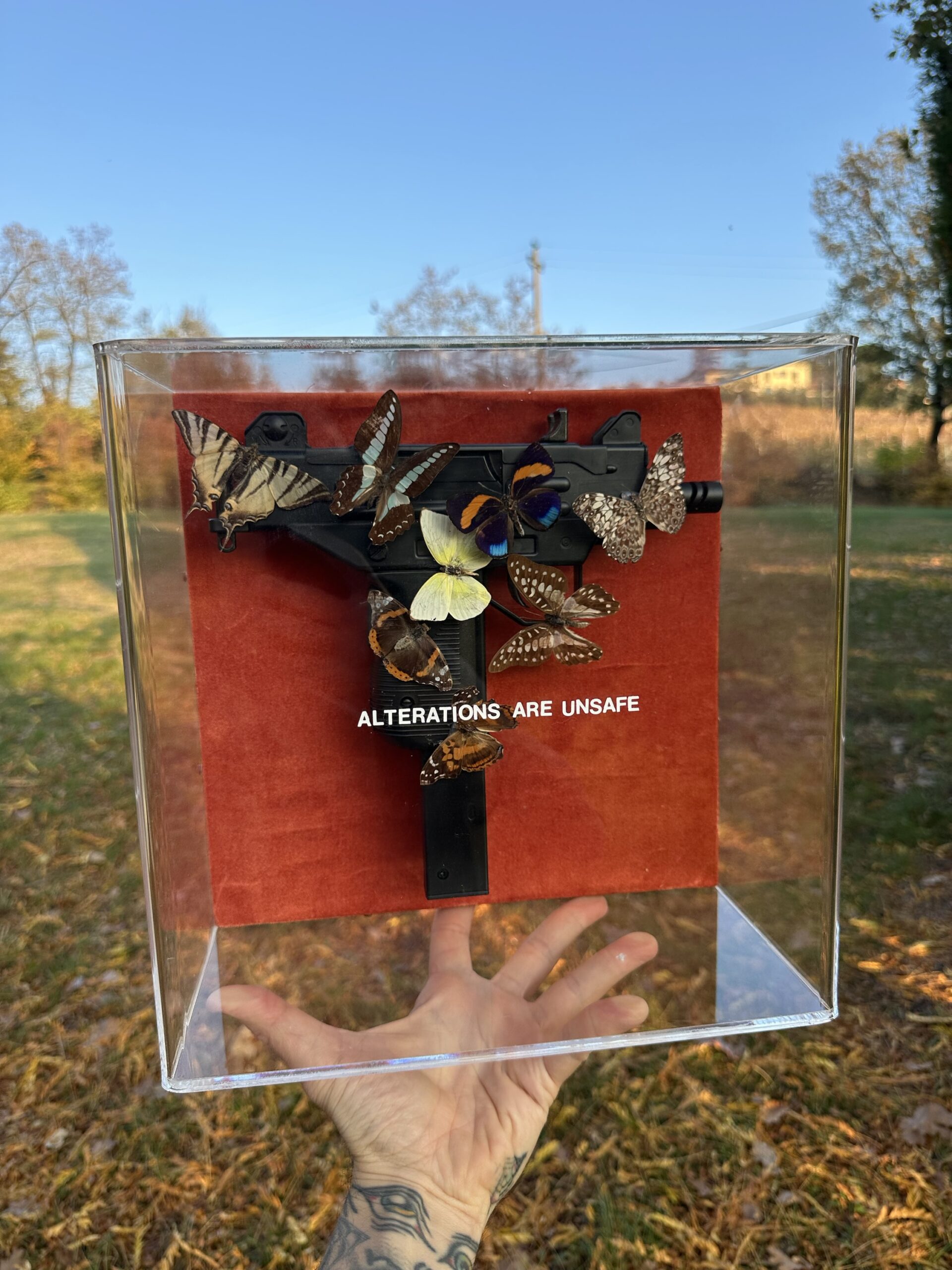 Uzi from Uziel Gal is a prop and not meant to shot while butteflies are real