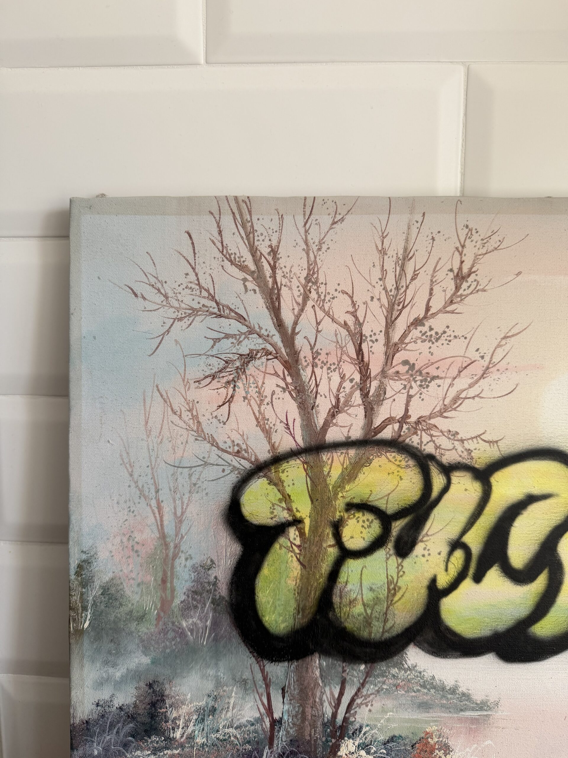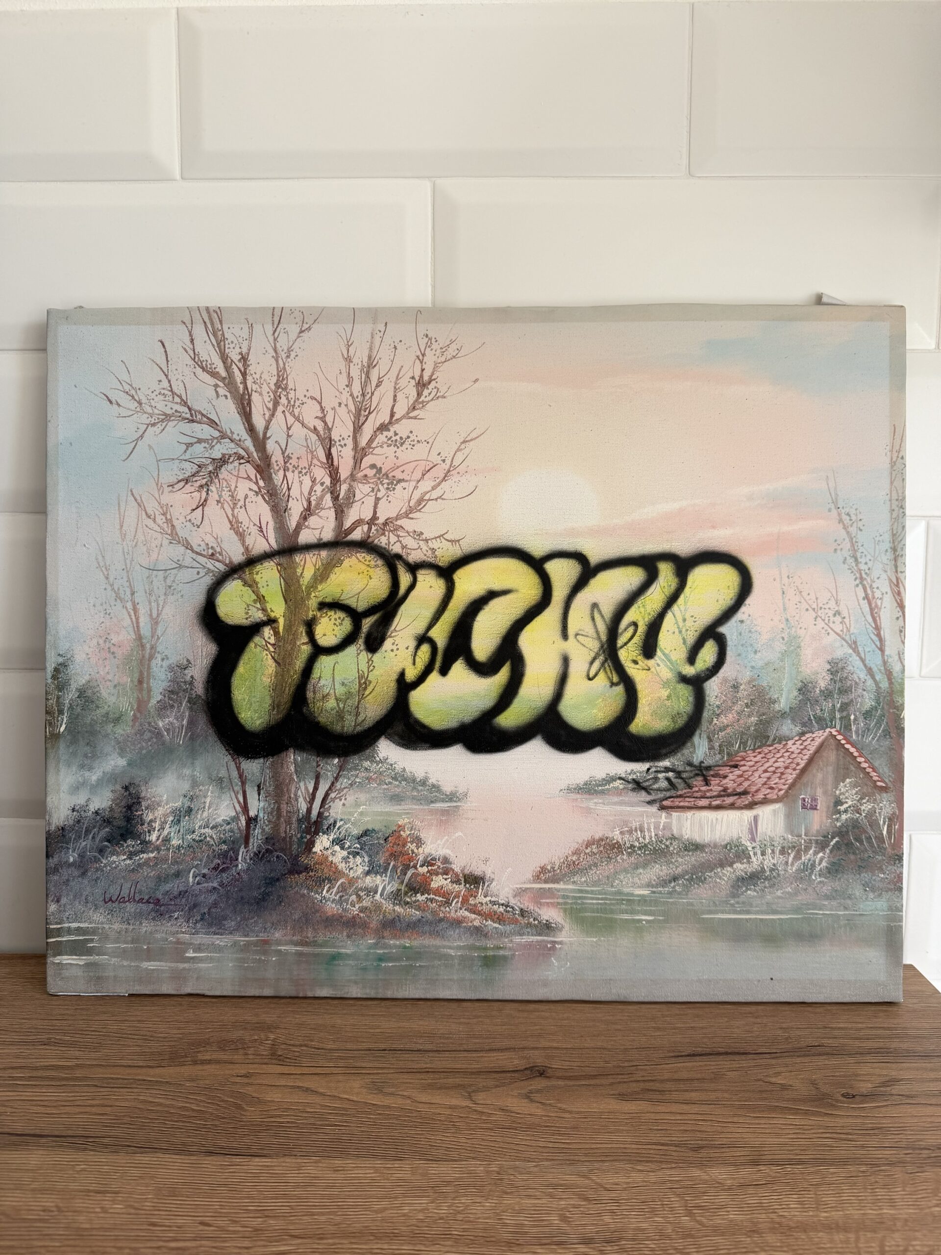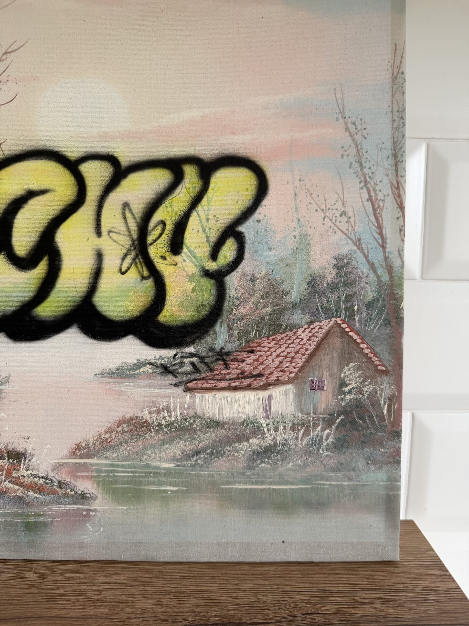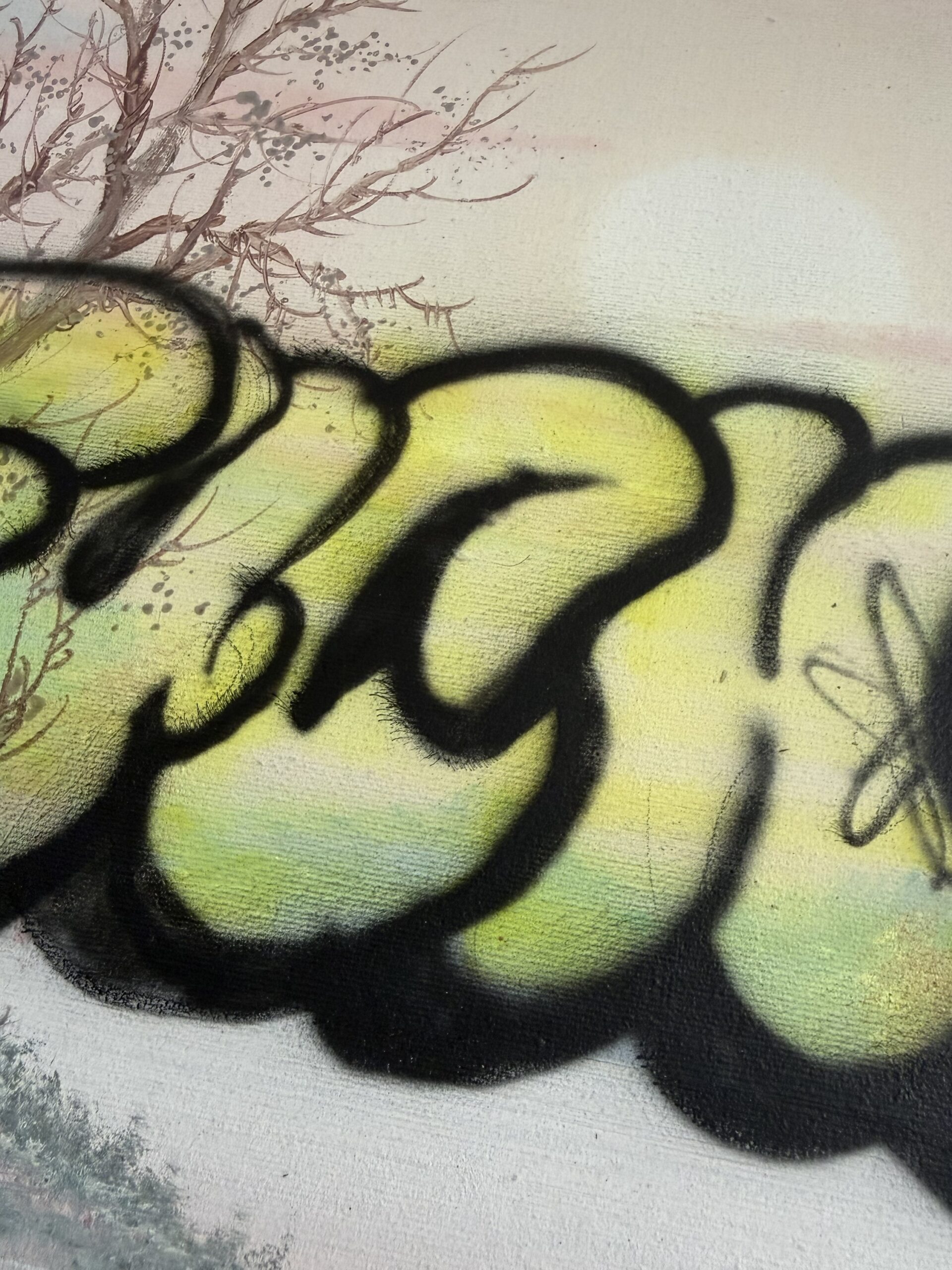 Classic Italian oil painting of a sad lake place ruined by a Fuck*u throw up graffiti