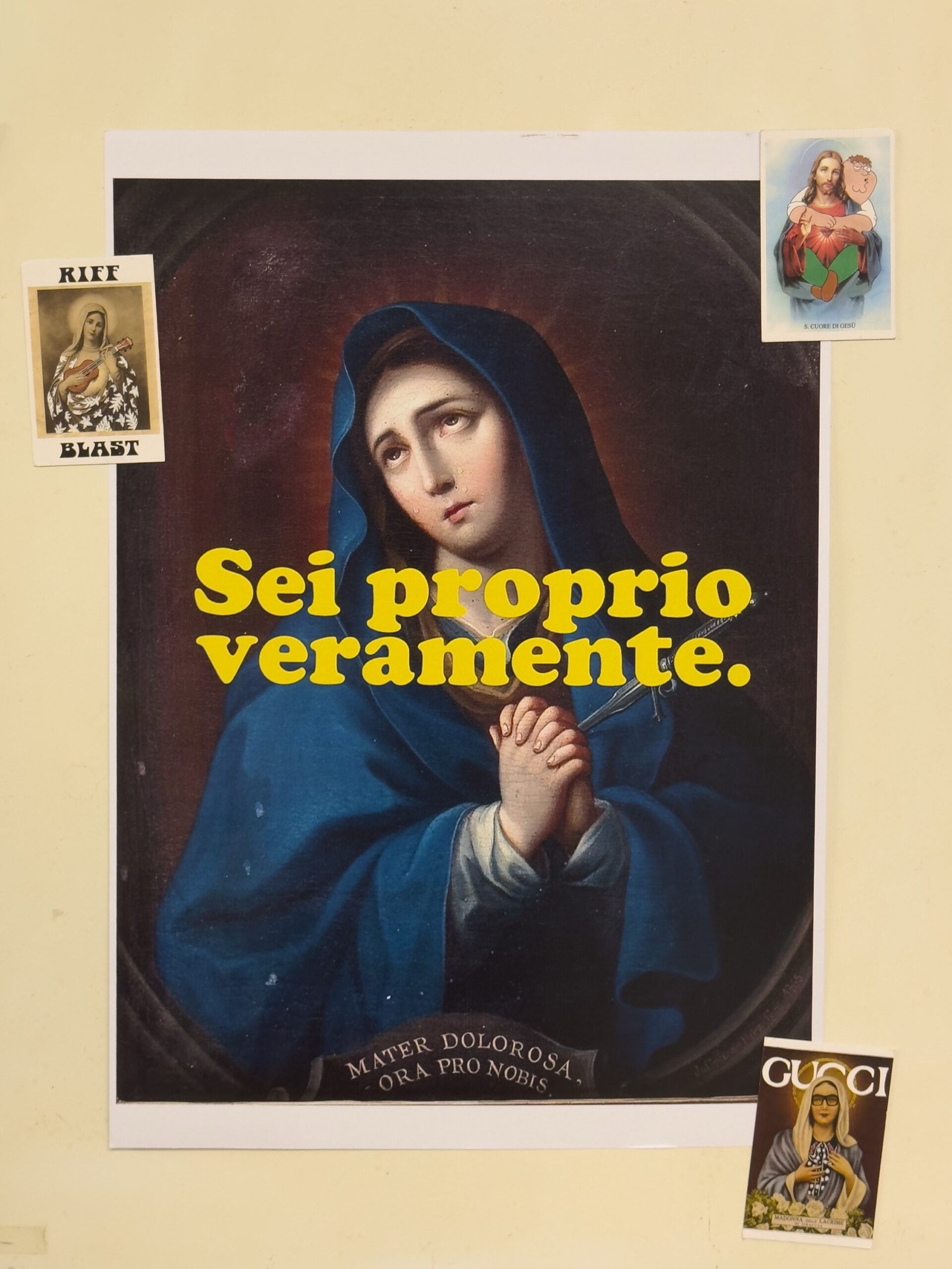 A playful blend of pop culture and sacred iconography, “Sei Proprio Veramente” reimagines a classic devotional image with a bold, ironic twist.