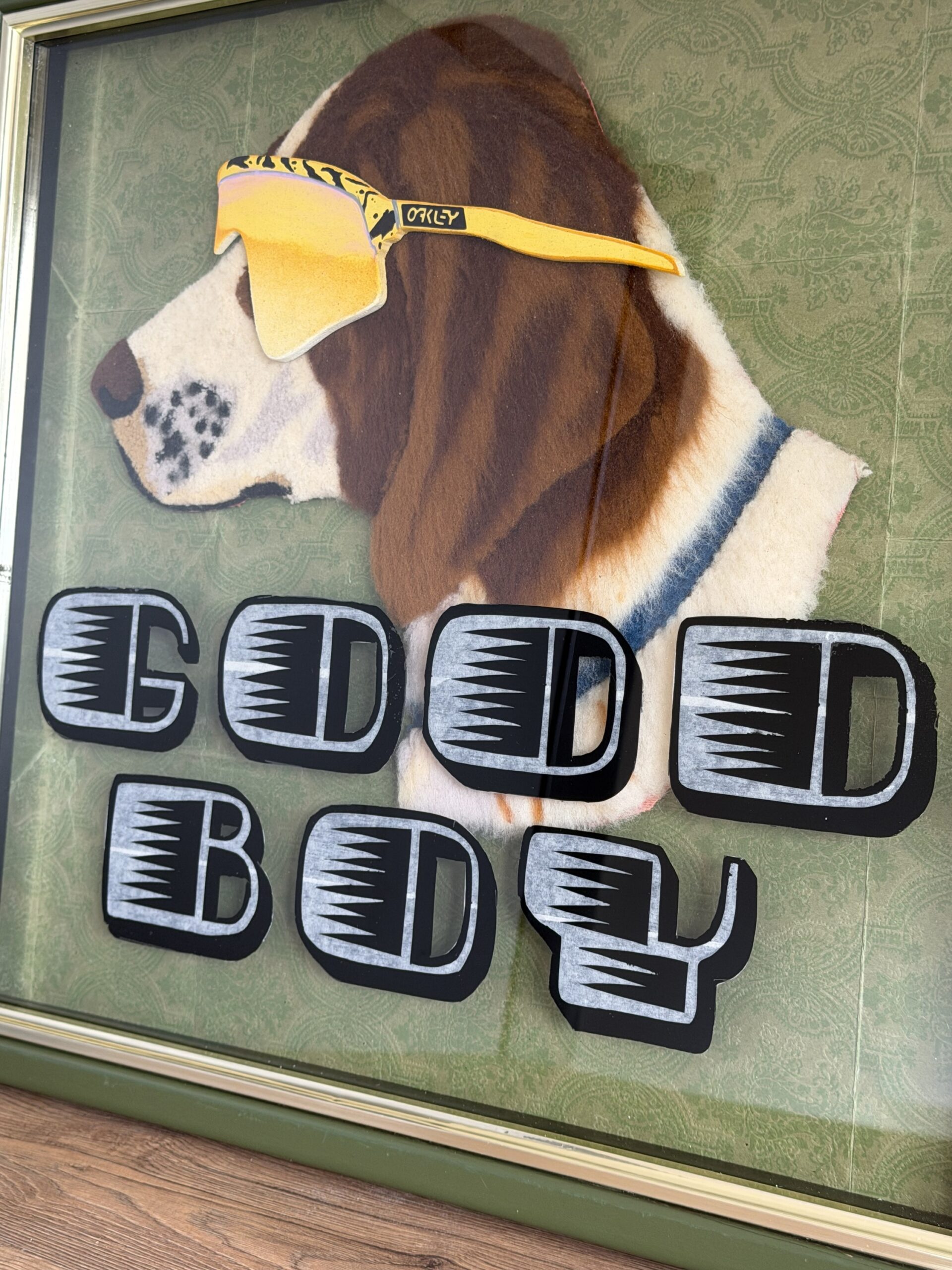 Old embroidery Dog now is a good boy with it’s new pair of fast sunglasses and a good boy Glass stencil stamp.